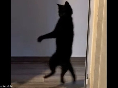 黒猫が2足歩行で登場して…子猫を驚かす(動画)